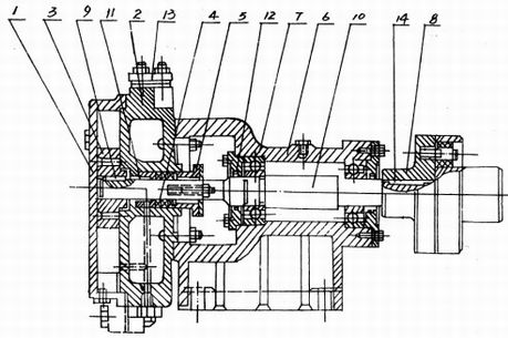 8. 聯軸器 9.葉輪(lun)平健 10.泵軸 11.填(tián)料環 12.軸承壓(ya)蓋 13.法蘭盤 14.聯(lian)軸器平健